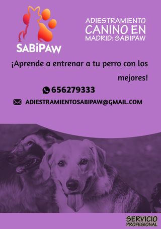 ¿Cansado de la desobediencia, los tirones de correa o ladridos sin fin? Sabipaw te ayuda a solucionarlos y crear un vínculo fuerte y feliz con tu peludo. Ofrecemos: Adiestramiento básico (órdenes, paseos tranquilos) Corrección de problemas de comportamiento (agresividad, ansiedad...) ¿Por qué Sabipaw? Expertos certificados en adiestramiento canino Métodos positivos y de refuerzo Atención personalizada para cada perro y dueño Resultados garantizados ¡No esperes más! Contacta con Sabipaw hoy mismo! Packs: 1 clase 40€ 4 clases 145€ 8 clases 270€ 12 clases 380€ 18 clases 560€ 24 clases 720€ anual 950€** **Consulta condiciones