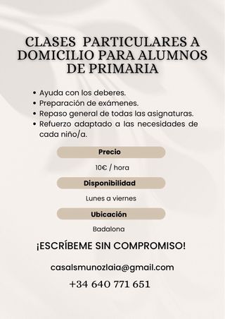 Soy Laia Casals. Ofrezco clases particulares a domicilio para niños de primaria en Badalona. Mis clases incluyen: • Refuerzo escolar general • Preparación para exámenes • Ayuda con los deberes. Estoy disponible de lunes a viernes. El precio por hora es de 10 €. Si estáis interesados, contáctame sin compromiso para más información.