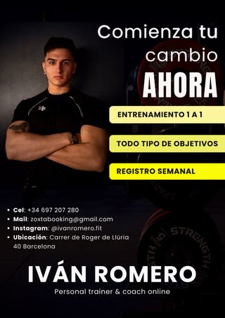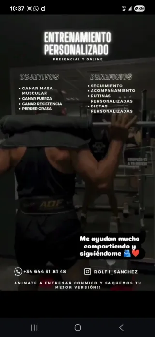 TIENES POCO TIEMPO O NO SABES POR DONDE EMPEZAR? Ofrezco entrenamientos personales, tanto de manera online como de manera presencial. Llevo más de 10 años entrenando diferentes disciplinas: Gimnasio, atletismo, futbol, calistenia... Y finalmente actualmente estoy desarrollandome más con el tipo de entrenamiento híbrido. Puedo ayudarte con una buena planificación, sea cual sea tu objetivo: Pérdida de peso, tonificación, ganancia de masa muscular, ganancia de resistencia... Y mucho más. Te proporcionaré una rutina muy completa la cual podrás desarrollar y compaginar con todas tus actividades! Instagram: @goldensoul.fit