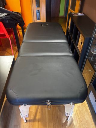 Camilla de la marca quirumed fija para terapias manuales, masajes, o entrenamiento personal, tiene el desgaste propio del uso pero es una camilla robusta y con una funda o un retapizado puede dar un uso perfecto.