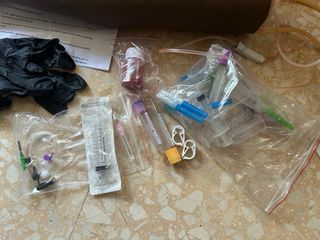 Este kit está prácticamente nuevo solo se le ha dado un uso. Consta de un brazo de piel oscura con el que practicar la venopunción, acompañado de jeringas, mariposas, vacutainers, guantes de nitrilo, tubos, soporte, polvos rojos para teñir el agua y simular líquido rojo.