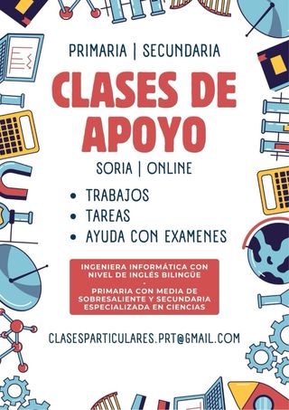 Ofrezco clases particulares de refuerzo educativo para alumnado de Primaria y Secundaria, adaptadas a las necesidades de cada estudiante. ✔️ Ayuda con tareas y trabajos ✔️ Preparación de exámenes ✔️ Refuerzo de contenidos y técnicas de estudio ✔️ Clases personalizadas y seguimiento continuo 👩💻 Sobre mí: Soy ingeniera informática, con nivel de inglés bilingüe. Experiencia en Primaria (media de sobresaliente) y Secundaria, especializada en ciencias. 📍 Modalidad: • Presencial en Soria. • Online desde cualquier lugar. Contacto sin compromiso: Por mensaje privado en Wallapop clasesparticulares.prt@gmail.com
