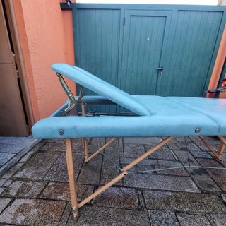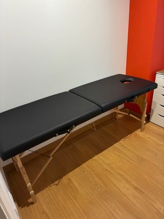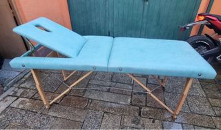 Camilla de masaje muy cómoda y práctica . Es bastante ancha y aguanta hasta 150kg . Es plegable y ajustable en altura . Cabeza reclinable para todo tipo de masajes o cualquier otro servicio. De madera por debajo y por arriba cuero sintético . Es mas práctico a la hora de limpiarla . Contiene su funda para transportarla .