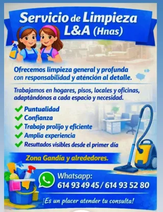 Ofrezco servicios de limpieza en casas, pisos apartamentos vacacionales en Gandia y alrededores. Experiencia demostrable, soy discreta,responsable y puntual. Por favor escribir sólo por temas estrictamente laborales.