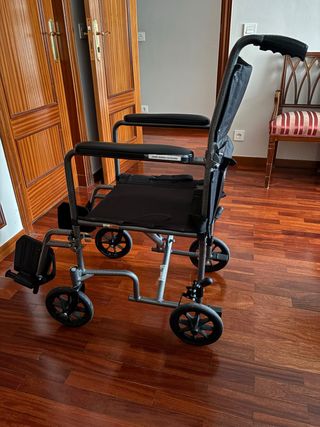 Muy buen estado. Se ha usado poco tiempo. Plegable y ligera de acero. Perfecta de tamaño para el maletero de un coche. Asiento 38 cm. Freno manual, reposapiés abatibles, cinturón. Perfecta para uso doméstico o para traslados cortos. Medidas 98f x 54 an. X 100 al