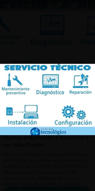Técnico con titulación oficial de FP Y Cisco en "Montaje, reparación, mantenimiento e instalación de sistemas microinformáticos" para Gijón y alrededores a domicilio. Cobro algo más desplazándome que atendiendo en sitio propio. 20 años de experiencia. Montaje de equipos nuevos para cualquier campo (ofimática, edición, entretenimiento, gaming, etc.). Reparación/sustitución de hardware en sobremesas y portátiles. Instalación, optimización y mantenimiento de Sistemas operativos (Windows XP, Vista, 7, 8, 8.1, 10, 11). Recuperación de datos en equipos con el SO caído. Limpieza virus/Malware. Precio económico. NO DOY SOPORTE ONLINE GRATUITO!!
