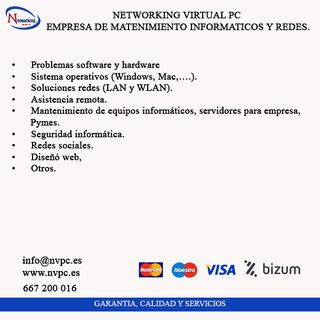 Networking Virtual PC es una empresa especializada en soluciones completas y a medida de informática, redes (WLAN,LAN…), y comercio electrónico. Especializados en informática, le ofrecemos recuperación de datos perdidos, mantenimiento de equipos y sistemas, creación de tiendas online y páginas web, además servicio de proveedores de Hardware, Software y Networking. Networking Virtual PC dispone de servicio técnico insitu y taller para solucionar los problemas que se le pueda plantear en sus equipos, periféricos y redes, y que necesite solucionar de la manera más profesional.