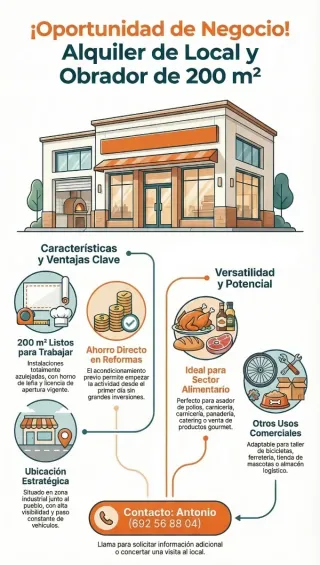 Se alquila instalaciones de obrador de panadería con licencia de apertura al día. Posee horno de leña. No hay maquinaria ni mobiliario. También puede utilizarse para cualquier otra actividad comercial como asador de pollo, venta de comestibles o comidas hechas, ferretería, taller de bicicleta....