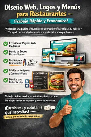 Diseño Web, Logos y Menús Profesionales - Rápido y Económico ¿Necesitas una página web moderna, un logo profesional o un menú atractivo para tu restaurante o negocio? Yo me encargo de diseñarlo todo con estilo actual y pensado para atraer clientes. SERVICIOS: Creación de páginas web modernas y optimizadas Diseño de logos personalizados Menús digitales y cartas para restaurantes Edición de imágenes y contenido visual Diseños para redes sociales Trabajo rápido, precios económicos y trato cercano. Ideal para negocios pequeños, marcas personales y emprendedores. Escríbeme sin compromiso y cuéntame que necesitas 💪
