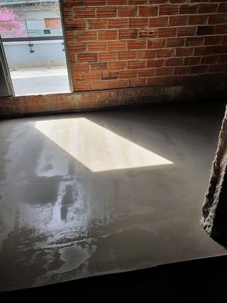 Suelo de epoxi de acabado brillante en color gris. Ideal para garajes, talleres o espacios industriales. - Acabado liso y reflectante. - Resistente a productos químicos y abrasión.