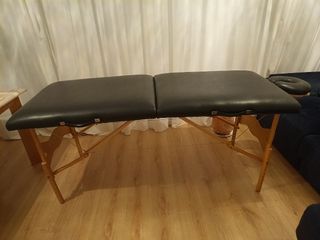 Se vende camilla plegable sin uso apenas. ESTA NUEVA, Estructura de madera, tapizado negra, con los complementos sun usar. SE ENCUENTRA EN SAN SEBASTIÁN DE LOS REYES, MADRID