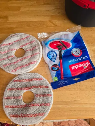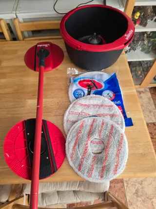 Cubo y mopa Vileda Spin & Clean Cubo, con palo y recambio No es una fregona tradicional ni mopa seca. El cubo es bajito. Es de los de empujar el palo con la mano tipo toco la zambomba, para no tener que girar la muñeca. En casa no se apañan con él, prefieren fregona tradicional porque no tienen artritis.