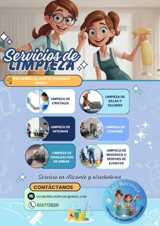 🧹 SERVICIO DE LIMPIEZA ✨ Responsabilidad y confianza 🏠 Limpieza de casas y departamentos 🏢 Oficinas y locales 🧼 Limpieza profunda o por horas ✅ Trabajo prolijo ✅ Puntualidad ✅ Buena presentación ✨ Espacios limpios y ordenados 📍 Zona: ____Alicante______ 📞 WhatsApp: ____643415702______ Con disponibilidad de desplazamiento Llámanos sin compromiso, Un cordial saludo. Gracias
