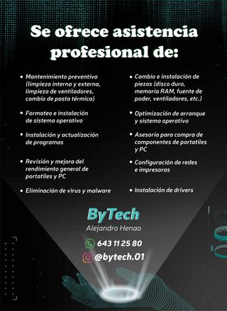 ¿Tu ordenador va lento? 🚀 Ofrezco servicios de: 🖥️ Reparación de ordenadores 🧹 Limpieza y mantenimiento 💿 Instalación de sistema operativo 🔧 Puesta a punto 🖱️ Montaje de nuevos equipos 📍 Cartagena 📲 Llámame al número de la imagen y te ayudo sin compromiso.
