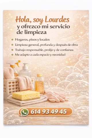 Servicio de limpieza para hogares y oficinas. Ofrezco limpieza por hora, con experiencia y referencias. Disponibilidad horaria flexible. ¡Contactame al whatsapp 622 - 878 - 613! También tengo experiencia en cuidado de niños y mascotas.