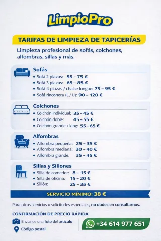 Contratando servicio a partir de 60€ descuento 10% para la primera contratacion! Transporte y desinfeccion incluidos en el precio! Ofrecemos el servicios de limpieza y/o desinfeccion integral de revestimientos textiles: - sofás de 65 € a 120 € - colchones de 50 € a 150 € - sillas de 8 € a 15 € (por unidad) - sillas de 35 € a 45 € Lavado en seco de interiores de automóviles: - sillas de auto 75 € - alfombras (textil) 10 € - alfombra 10€ - maleteros 20 € El precio puede variar según el grado de la suciedad.