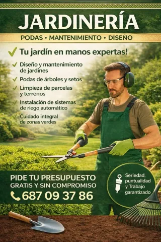 Se ofrecen servicios de jardinería: poda de setos, poda de árboles y arbustos, corte de césped, aplicación de abonos, aplicación de fitosanitarios contra plagas, composiciones de plantas, poda de formación de árboles, desbroces de malezas, limpieza de parcelas, recogida de residuos vegetales . Dispongo de toda maquinaria necesaria para cualquier trabajo ( cortacésped, desbrozadora, cortasetos, cortasetos de altura, sopladora, sulfatadora, esparcidor, motosierra, escalera telescópica, etc) Consultar sin compromiso . También nos encarcamos del mantenimiento integral de piscinas.