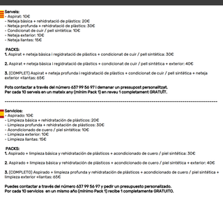 Servicios: - Aspirado: 10€ - Limpieza básica + rehidratación de plásticos: 20€ - Limpieza profunda + rehidratación de plásticos: 30€ - Acondicionado de cuero / piel sintética: 10€ - Limpieza exterior: 10€ - Limpieza llantas: 15€ PACKS: 1. Aspirado + limpieza básica y regidratación de plásticos + acondicionado de cuero / piel sintética: 30€ 2. Aspirado + limpieza básica y regidratación de plásticos + acondicionado de cuero / piel sintética + exterior: 40€ 3. (COMPLETO) Aspirado + limpieza profunda y regidratación de plásticos + acondicionado de cuero / piel sintética + limpieza exterior +llantas: 65€