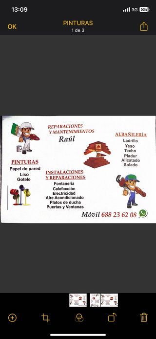 Buenas, mi nombre es Raul..Nos dedicamos hacer todo tipo de trabajos, fontanería, electricidad,alicatado,solado, pinturas en locales,comunidades,Limpieza de canalones e impermeabilización de fachadas y tejados.todo tipo de trabajos recomendados y garantizados, damos presupuesto sin compromiso. NOS DESPLÁZAMOS TODA PARTE DE MADRID.