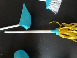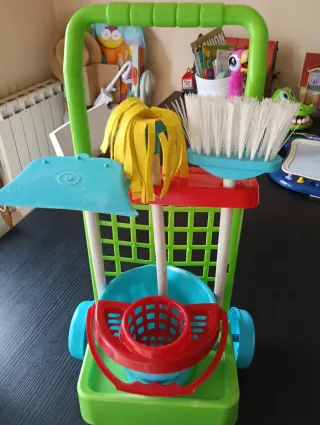 Carrito de limpieza para niños. Se nota que está usado Además en el mango de la fregona le falta el tapón azul de arriba como llevan la escoba y el recogedor.. No tiene nada roto