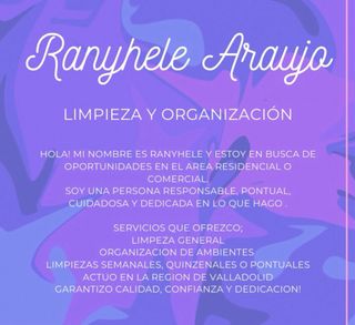 servicios que ofrezco; limpeza general organizacion de ambientes limpiezas semanales, quinzenales o pontuales Actuo en la region de Valladolid Garantizo calidad, confianza y dedicacion!