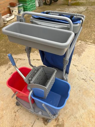 Carro de limpieza con escurridor de fregona y dos cubos de agua. En buen estado. Disponibles 3 unidades. Precio negociable si compras las 3.