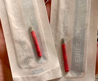 Utensilio microbleding, dos hojas de agujas nuevas, regla y dos pieles de pratica