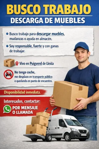 Busco trabajo para descargar muebles, mudanzas o ayuda como mozo. Soy una persona fuerte, responsable y con ganas de trabajar. Vivo en Puigverd de Lleida. No tengo coche, puedo quedar en punto de encuentro. Disponibilidad inmediata. WhatsApp 641263027