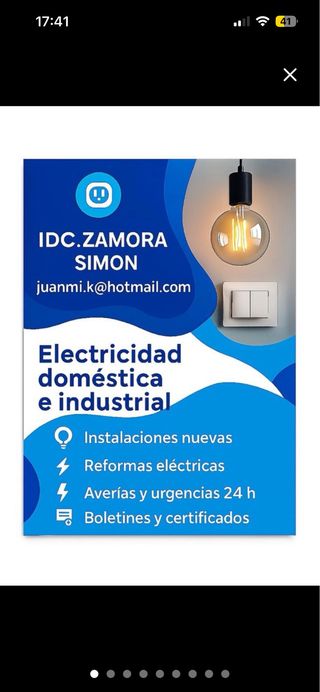 IDC ZAMORA SIMON Instalaciones domésticas e industriales Electricidad doméstica e industrial con garantía de seguridad y profesionalidad. Realizamos: - Instalaciones eléctricas nuevas - Reformas y ampliaciones de instalaciones - Averías eléctricas y urgencias 24 horas - Boletines y certificados eléctricos oficiales Trabajo serio, limpio y conforme a normativa vigente. Atención rápida, trato directo y soluciones duraderas. Contacto: juannmi.k@hotmail.com