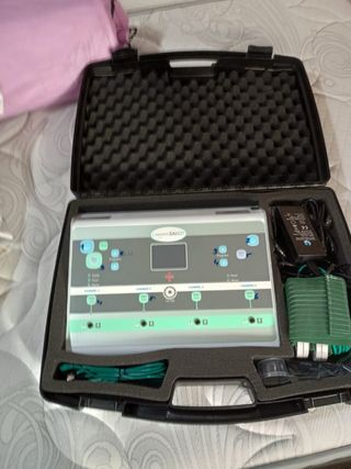 Electroestimulador MagnetoSalud en perfecto estado. Incluye dos cables y electrodos. Ideal para fisioterapia. - Dispone de varias funciones. - Incluye maletín de transporte. - Fácil de usar.