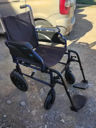 Silla de ruedas plegable. Azul y negra. Reposapiés desmontables y giratorios. Usada poco tiempo.