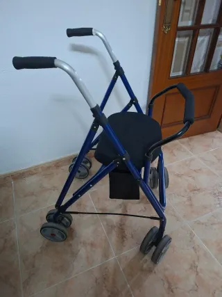 Andador Rollator LEOX en color azul, diseñado para facilitar la movilidad. - Estructura plegable para un fácil almacenamiento y transporte. - Asiento integrado para descansar. - Bolsa de compras. - Ruedas para un desplazamiento suave.