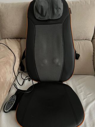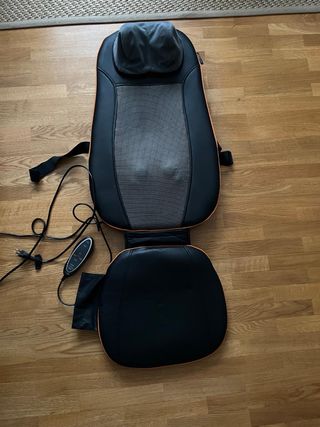 Respaldo masajeador de espalda y cuello de Medisana. Con calor. Varios programas y temporizador. Está usado pero impoluto, bien cuidado. - 3 zonas de masaje: superior, inferior y espalda completa - Calor y luz roja - función vibración del asiento - la zona del cuello es desenfundable y lavable - masaje cervical, dorsal y lumbar
