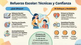 Doy clases partículares para Primaria y Eso. Soy graduada en ADE (cursado en inglés) y actualmente curso el Máster de Profesorado de Secundaria y Bachillerato. Trabajo presenciaente en Lugo y alrededores (Vilalba, Rábade...) y online para cualquier lugar. Me interesa mucho la psicología adolescente, me gusta entender cómo aprende cada alumno, y qué necesita. Ofrezco: 📚Refuerzo escolar primaria y ESO ✏️ Ayuda con deberes, trabajos y exámenes 🌏Presencial (Vilalba, Lugo y alrededores) u online Precios negociable: Online: 9€/hora Presencial 12€/hora Grupos: a negociar Contacto 📱698190559 belen03rc@gmail.com Escríbeme sin compromiso!-