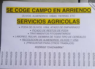 se coge campo en arriendo servicios agrícolas picado de restos de poda atado de viñas emparrado poda de olivas siembra con sembradora de precision desvaretado chuponado recolectores de aceituna uva almendros pistachos preguntar sin compromiso precios condiciones y demás trabajos nos desplazamos teléfono 602 21 65 29 #alquiler, fincas, finca, riego, tierras, cebada, hectáreas, viñas, parras, emparrado, olivo, oliva, picado, picar, triturado, poda, campañas, recogida, recolección, paraguas, almendras, almendros, pistacho, siembra #