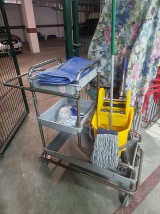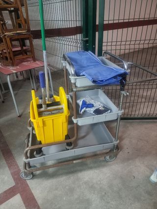 carro de limpieza profesional con todos los accesorios (cubo con escurridor, palo con pinza y fregona, bolsa para basura), más recambio de mocho y pinza de enganche nuevos.