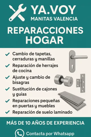 ¿Se ha roto algo en casa y necesitas solucionarlo rápido? Realizo todo tipo de reparaciones del hogar: ✔ Reparación de puertas ✔ Ajuste de muebles y armarios ✔ Reparación de bisagras y cajones ✔ Cambios de grifos ✔ Reparación de cisternas ✔ Instalación de lámparas y accesorios ✔ Pequeños arreglos del hogar Trabajo rápido, limpio y con soluciones prácticas. 📍 Valencia y alrededores 🛠 Ya Voy Manitas Valencia Más que manitas