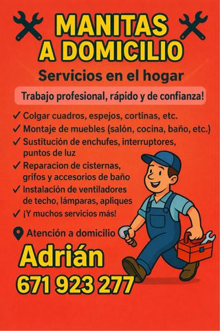 🔧 Reparaciones básicas • Arreglo de grifos, cisternas y fugas • Cambio de enchufes, interruptores y bombillas • Ajuste de puertas y cerraduras. 🛠️ Montaje e instalación • Montaje de muebles • Colgar cuadros, estanterías y espejos • Instalación de lámparas y ventiladores de techo • Colocación de cortinas y barras 🏠 Mantenimiento del hogar • Sellado de juntas (silicona en baño/cocina) • Pequeños trabajos de pintura y retoques. ⚙️ Otros servicios • Instalación de accesorios de baño • Colocación de televisores en pared • Ajuste de electrodomésticos básicos • Cambios de cerraduras.