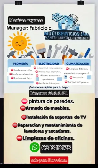 🔧 Servicio de Manitas – Reparaciones y Montajes 🔧 Ofrezco servicios de manitas a domicilio en Barcelona y alrededores. ✔ Montaje de muebles ✔ Instalación de lámparas, cortinas y estores ✔ Montaje de enchufes, interruptores, cambio de diferenciales. ✔ Colgar cuadros, TVs y estanterías ✔ Grifería, lavabos y pequeños trabajos de fontanería ✔ Ajustes de puertas, persianas y reparaciones del hogar Trabajo limpio, puntual y con herramientas profesionales. Precios justos según trabajo. 📩 Escríbeme sin compromiso y dime qué necesitas