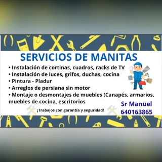 Manitas, necesitas algún arreglo en tu hogar? Reparación de persianas. Electricidad: Cambio de toma corriente, cambio de interruptores, cambio de bombillas, lámparas, instalación de TV con base, reparación de electrodomésticos. Fontanería: Instalación de lavadoras, cambio de cisterna, cambio de griferia, colocación de accesorios para el baño. Pintura de paredes y rejillas. Carpintería: instalación de inmobiliario, reparación de puertas, instalación de cerraduras. Se montan: Cajoneras, armarios, sillas, mesas, etc. Soy profesional serio con más de 20 años de experiencia y me ajusto a tu presupuesto.
