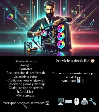 -Mantenimiento -Arreglo -Formateo -Recuperación de archivos de dispositivos rotos -Configuraciones en general -Elección de piezas y montaje -Cualquier tipo de servicio informático -Voy a tu casa! *Hago currículo profesional a tu gusto* Precio por debajo del mercado!! 🖥️🔧 CONTACTAR EN ESCRITO POR WHATSAPP 611835001