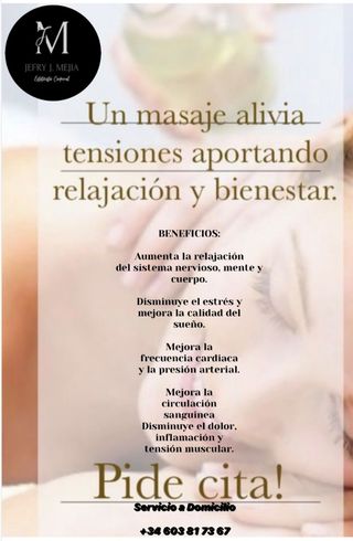 💆♂️ Bienestar corporal y alivio muscular ¿Dolor, estrés o sobrecarga muscular? Con más de 15 años de experiencia, te ayudo a sentirte mejor con tratamientos personalizados: ✔️ Masaje relajante ✔️ Descontracturante ✔️ Deportivo ✔️ Ventosas y moxibustión Sesiones enfocadas en aliviar tensiones, mejorar la movilidad y recuperar tu bienestar. 📩 Escríbeme sin compromiso y reserva tu cita. ( NO ERÓTICOS )