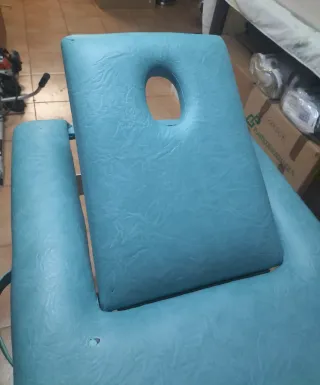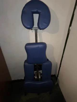 Vendo silla de masaje ergonómica profesional en color azul. Diseñada para ofrecer la máxima comodidad tanto al cliente como al terapeuta, permitiendo un acceso total a la espalda, cuello y hombros. Características principales: Totalmente ajustable: Altura y ángulo regulables en el reposacabezas, soporte para el pecho y apoyabrazos para adaptarse a cualquier estatura. Diseño Plegable: Se pliega de forma compacta en segundos, lo que la hace ideal para servicios a domicilio o para guardar sin ocupar espacio. Estado: En buen estado general. El acolchado del reposacabezas se ha remplazado por uno nuevo del mismo color.