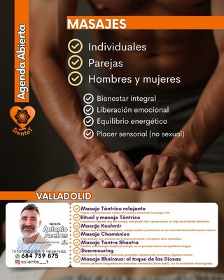 Masajes tántricos y sensoriales en Valladolid, para hombres, mujeres, individuales o parejas, con enfoque en bienestar integral, liberación emocional y equilibrio energético, siempre desde un espacio seguro y no sexual. Amplio horario, espacio privado. Posibilidad a domicilio.Precios desde 50€ /45 minutos IG:@siente__t