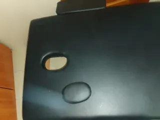 Camilla de masajes acabada en madera y un cojín para poner los pies y realizar mejor los masajes. Uso prácticamente nueva.