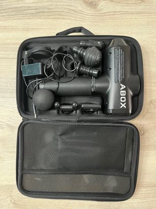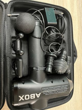 Pistola Masajes Fisiogun Pro + 4 Cabezales + maletín, 9 niveles, instrucciones en código QR y cable de carga C. Semi nuevo!! En perfecto estado.