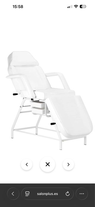Vendo camilla de estética prácticamente nueva, usada en 4 ocasiones y guardada, ideal para centros de belleza, masajes, tratamientos faciales, depilación, manicura o pedicura. ✔ Respaldo reclinable manual ✔ Reposapiés ajustable ✔ Orificio facial con cojín ✔ Reposabrazos cómodos ✔ 2 bandejas/cajones inferiores para almacenamiento ✔ Estructura metálica resistente ✔ Tapizado blanco fácil de limpiar Es muy cómoda y estable. Perfecta tanto para uso profesional como para montar tu propio espacio en casa. También tengo fundas de celulosa desechables Se puede ver sin compromiso. (No hago envíos / Actualmente desmontada )