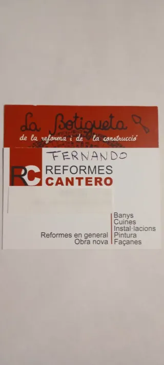 Hola, realizamos obras y reformas desde hace 36 años. Realicé las obras de "La botigueta de la reforma i la construcció" en el barrio de Sants durante 12 años, aparte de la tienda llevo trabajando por ese mismo barrio y por toda Barcelona desde hace 36 años.Mi nombre es Fernando y muchos me conocéis. Los que me perdisteis la pista podéis volver a contactar conmigo por aquí. Seguimos haciendo todos tipo de reformas integrales, pequeñas reparaciones y obra nueva, tanto en Barcelona ciudad como por toda la provincia y dependiendo de los trabajos, por toda Catalunya. Presupuestos sin compromiso. Seriedad y profesionalidad garantizadas.