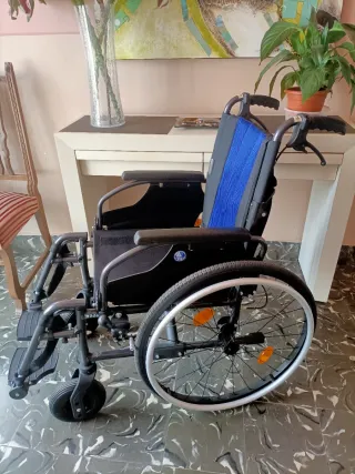 Silla de ruedas grandes aluminio, ligera, plegable, respaldo antialérgico, reposabrazos y reposapiés abatibles y desmontables. Cuenta con diferentes anchos de asiento. Autopropulsable, puede desplazarse con independencia. Resistente silla compuesta por estructura metálica de aluminio. Tubo de 25 mm. Silla de ruedas duradera con fuertes reposabrazos, resistentes plataformas y eficiente freno. Confortable, respaldo con tapicería transpirable e interior acolchado. Reposapiés a 70º, desmontables y giratorios. Nueva, sin haberse usado una sola vez. Aún conserva el precinto de las ruedas. En perfecto estado. Incluye cojín visco y funda.