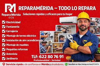 🔧 REPARAMÉRIDA – Servicios 24 horas en Mérida 🔧 ¿Buscas electricista en Mérida, fontanero en Mérida o un servicio de reparaciones urgentes 24 horas? En REPARAMÉRIDA solucionamos cualquier avería rápida y profesionalmente. ✅ Electricidad en Mérida ✅ Fontanería en Mérida ✅ Montaje de termo eléctrico ✅ Montaje de calentador de gas ✅ Instalación de aire acondicionado ✅ Arreglo de persianas ✅ Antenista ✅ Pequeños electrodomésticos ✅ Reformas y pladur 📍 Trabajamos en Mérida y alrededores 📞 Llámanos o WhatsApp: 622 80 76 91 ⏰ Servicio urgente 24/7 Si buscas empresa de reparaciones en Mérida, REPARAMÉRIDA te lo arregla 💪 #ElectricistaM
